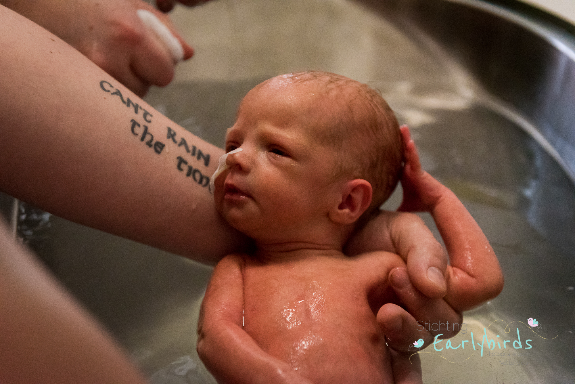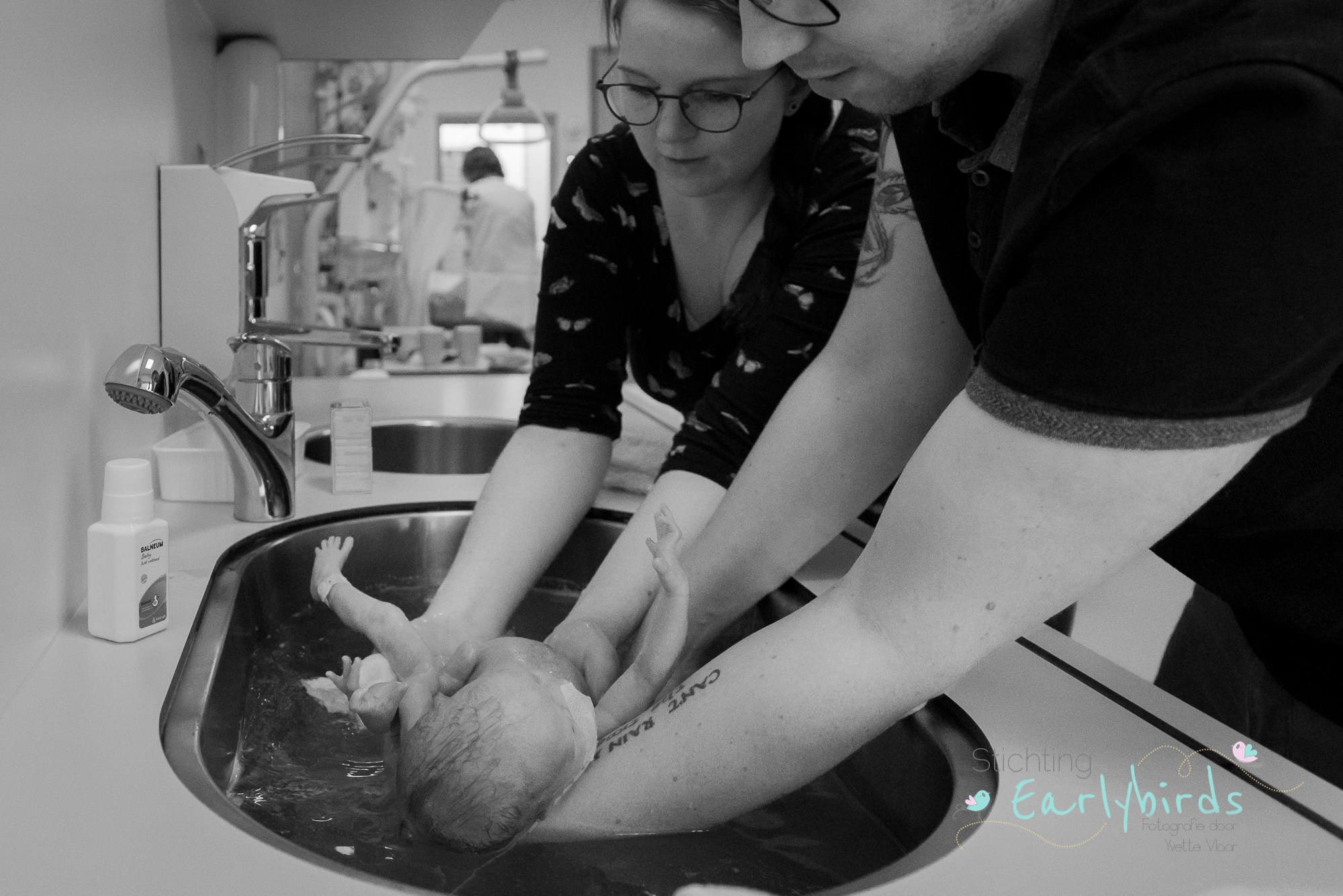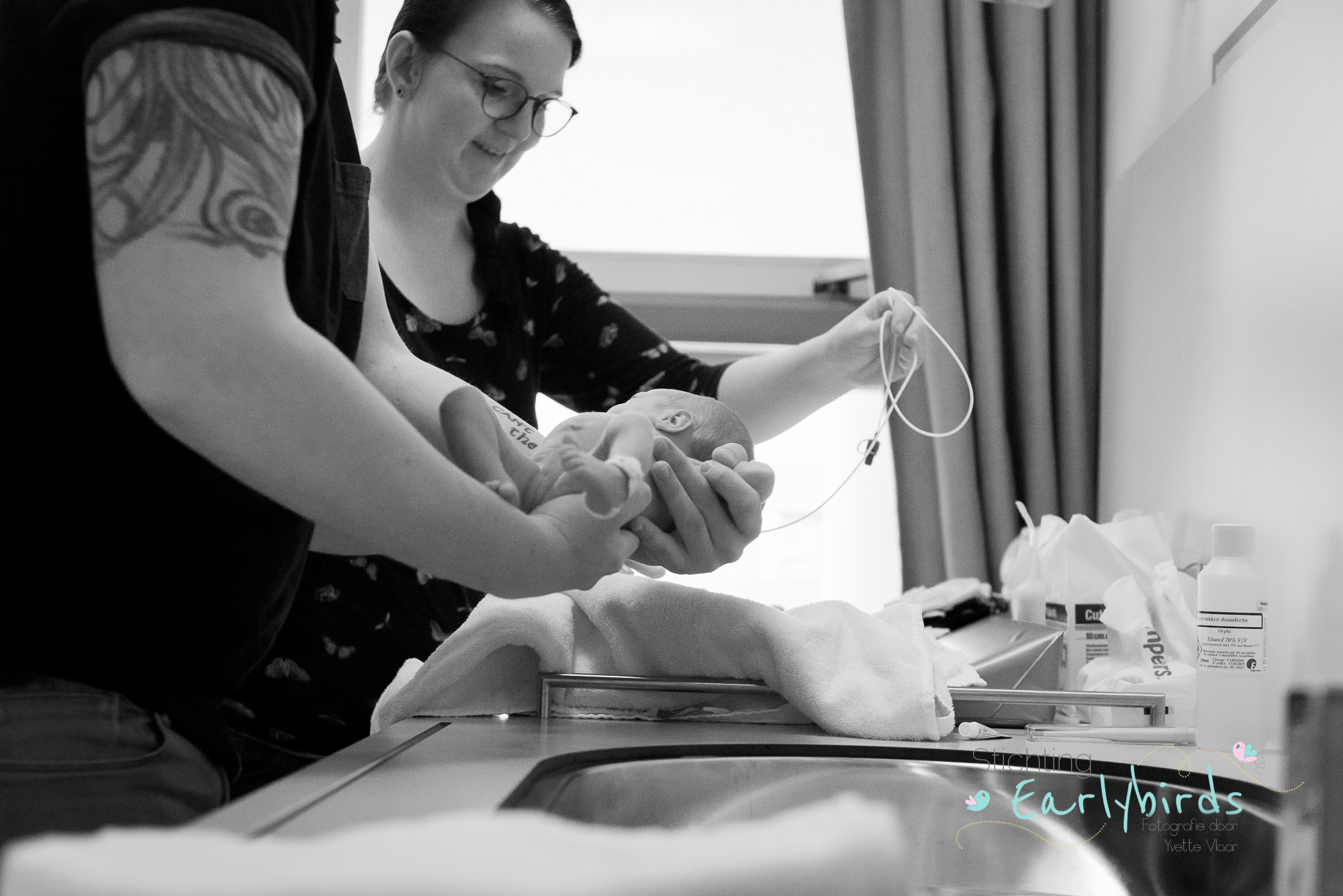 Elynn werd geboren met 32 weken en 5 dagen en gelukkig was ze van Amsterdam naar Hoorn verhuist. De papa en mama van Elynn waren er al helemaal klaar voor op het moment dat ik binnen kwam. Het badje werd klaargemaakt en de wegingen konden starten.